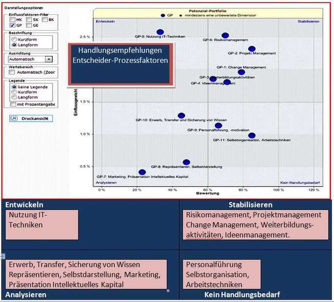 Ein Wissensbilanz-Management-System erlaubt es Unternehmen, strategische Ziele zu erkennen und umzusetzen D. Ein solches Planungssystem ermöglicht außerdem die langfristige Erfolgskontrolle der angewandten Strategie. Um eine Messlatte zu haben, muss das Unternehmen vor der Implementierung eines Wissensbilanz-Systems erst seine zu erreichenden Ziele definieren und die dafür notwendigen Mittel und Maßnahmen festlegen. Die Performance wird dann über einen längeren Zeitraum an diesen Parametern gemessen, d.h. Daten werden gesammelt, analysiert und die Resultate in entscheidungsrelevanter Form präsentiert.